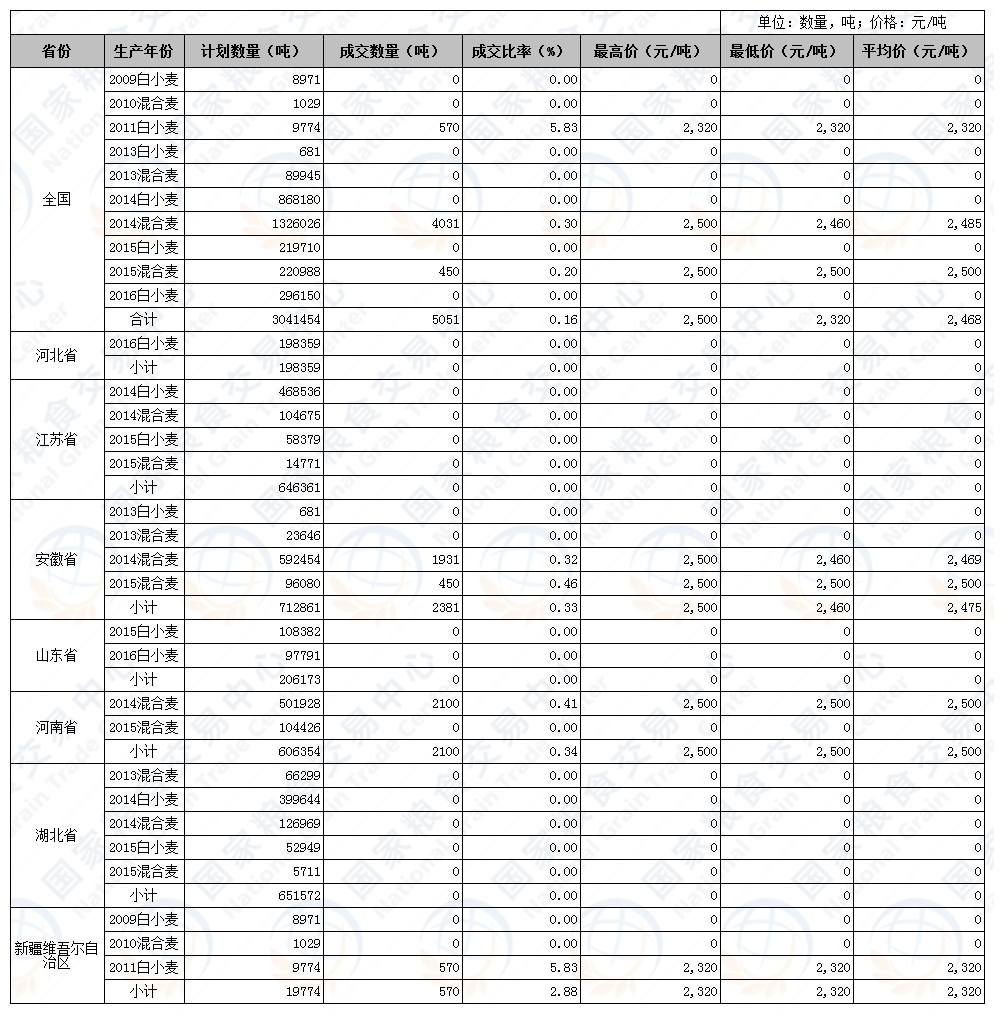 15年产混合小麦计划投放220988吨,仅成交450吨,成交价格为2500元/吨,其他年份的小麦成交率均为0,综合成交率仅有0.15%,成交结果仍不尽人意。