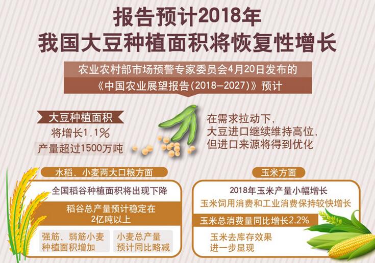 农业农村部市场预警专家委员会20日发布的《中国农业展望报告(2018-2027)》预计,今年全国大豆种植面积将保持恢复性增长,进口来源结构进一步优化。