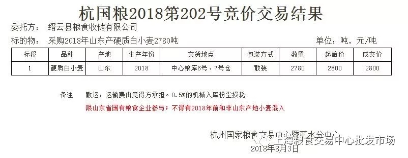 在8月3日杭州国家粮食交易中心的一笔小麦采购竞价交易中,缙云县粮食收储有限公司以2800元/吨的价位购得山东硬质白小麦2780吨,这意味着这批小麦的价格达到1.4元/斤。