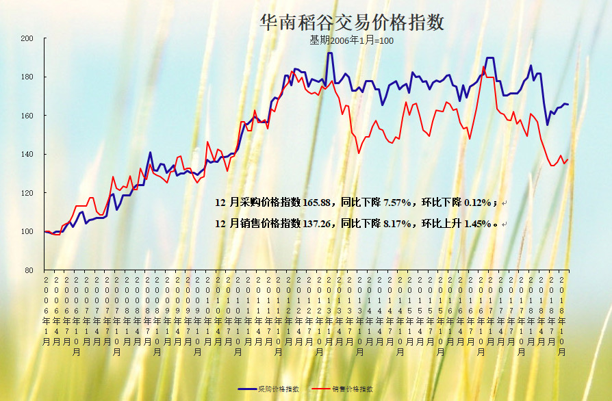 12月份华南稻谷采购价格指数报165.88,同比下降13.59个点,降幅为7.57%,环比下降0.2个点,降幅为0.12%。采购竞价量和成交量均略有减少,成交价同比小幅扩大,环比微跌。
